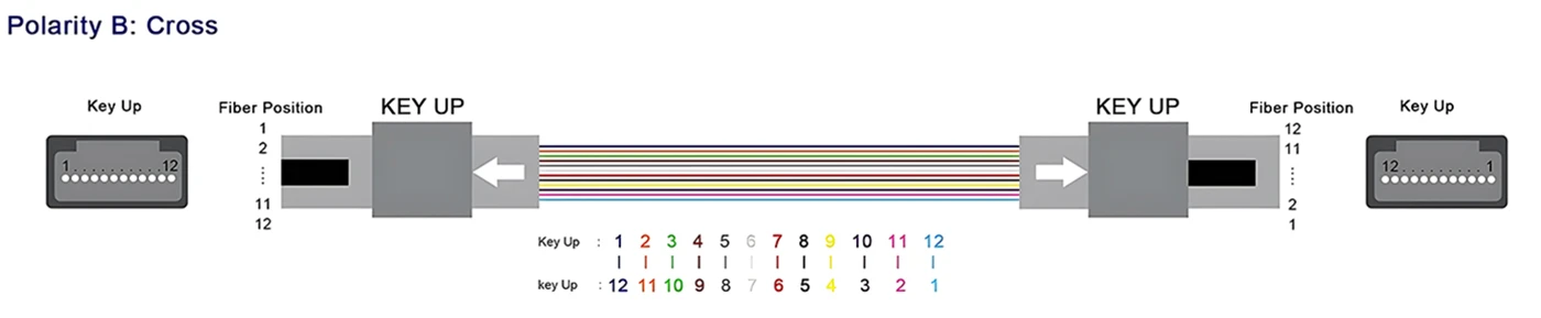 In practice, Fiber 1 on one connector maps to Fiber 24 on the opposite connector, Fiber 2 maps to Fiber 23, and so on. This crossed polarity ensures that transmit (Tx) signals from one device are correctly aligned with receive (Rx) signals on the other device, which is essential for duplex and parallel optics communication.