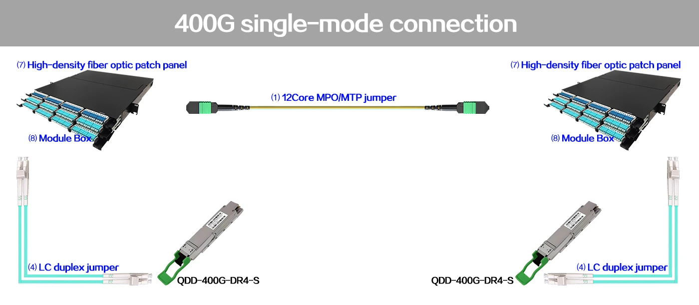 When the 400G QSFP-DD DR4 optical modules at both ends of the machine room can be connected through MPO/MTP-8 single-mode fiber jumpers to achieve 400G transmission.